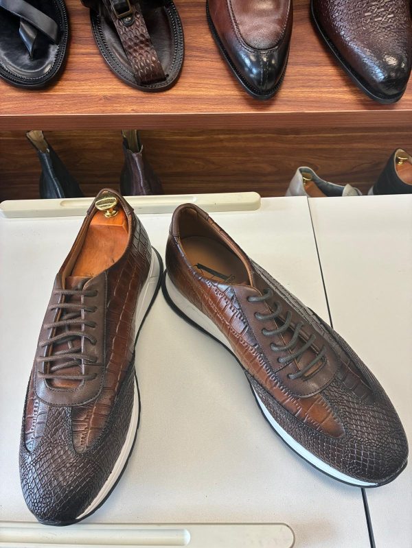 Chocolate Brown Croc-Embossed Leather Sneakers with Contrast Panel Detailing