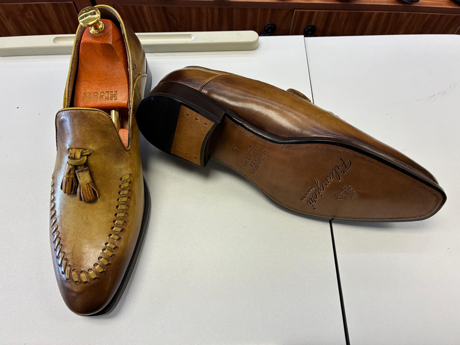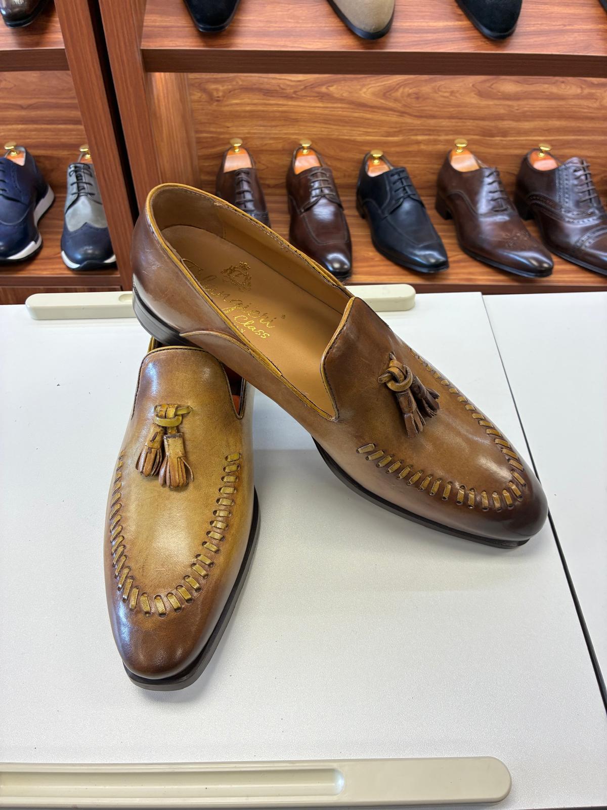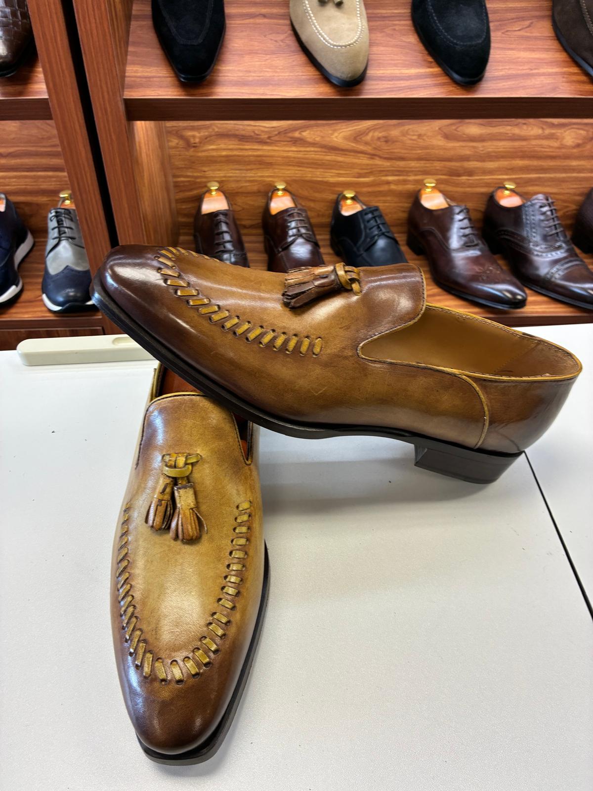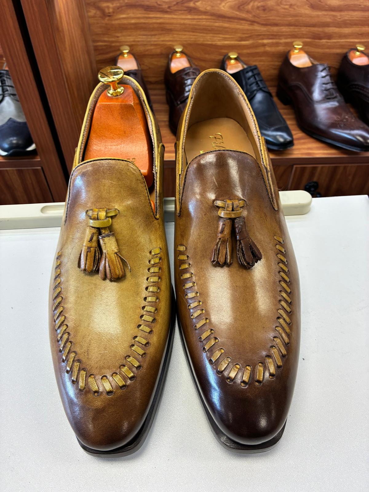 Hand-finished brown leather loafers with classic tassel detailing, rich patina tones, and bold stitched accents, delivering a timeless blend of artisanal character, comfort, and refined elegance.