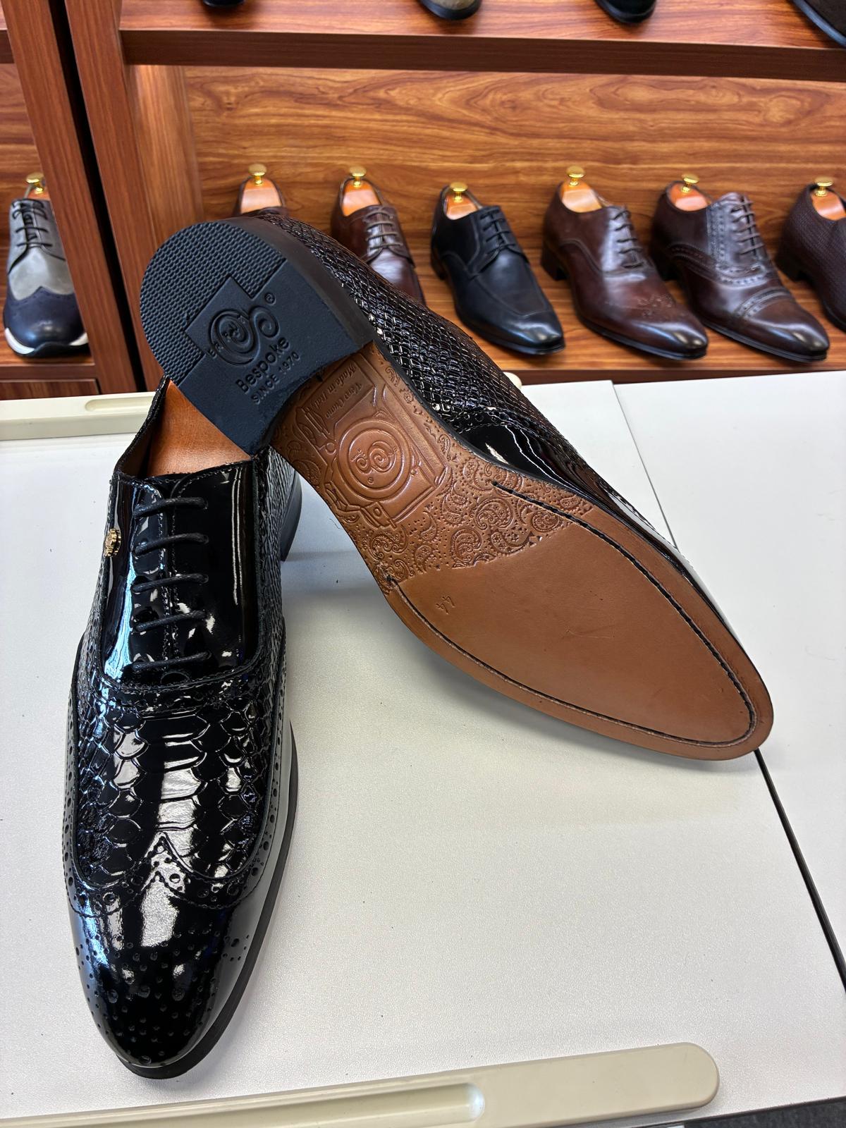 Crafted for those who appreciate standout luxury, these black patent leather Oxford shoes feature a rich crocodile-embossed texture with a mirror-like high-gloss finish. The sleek lace-up silhouette, refined stitching, and structured profile create a powerful formal look, while the smooth inner lining ensures all-day comfort. Perfect for weddings, executive meetings, and evening events where sharp style and confidence matter most.