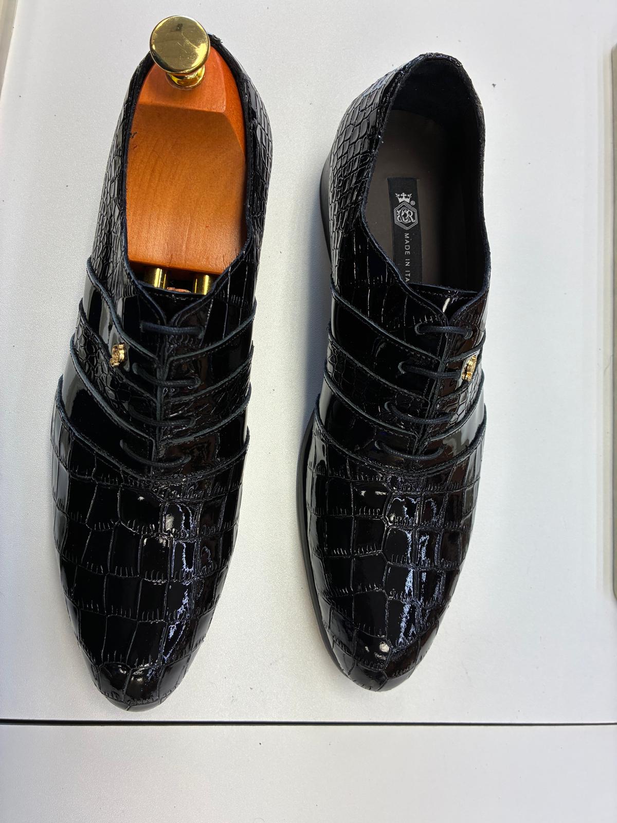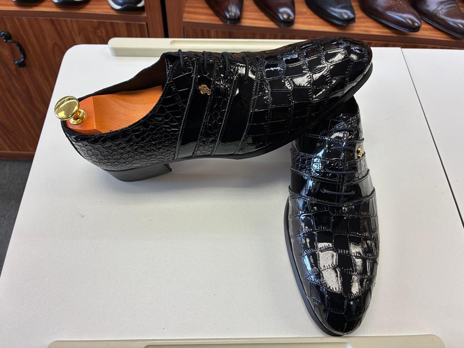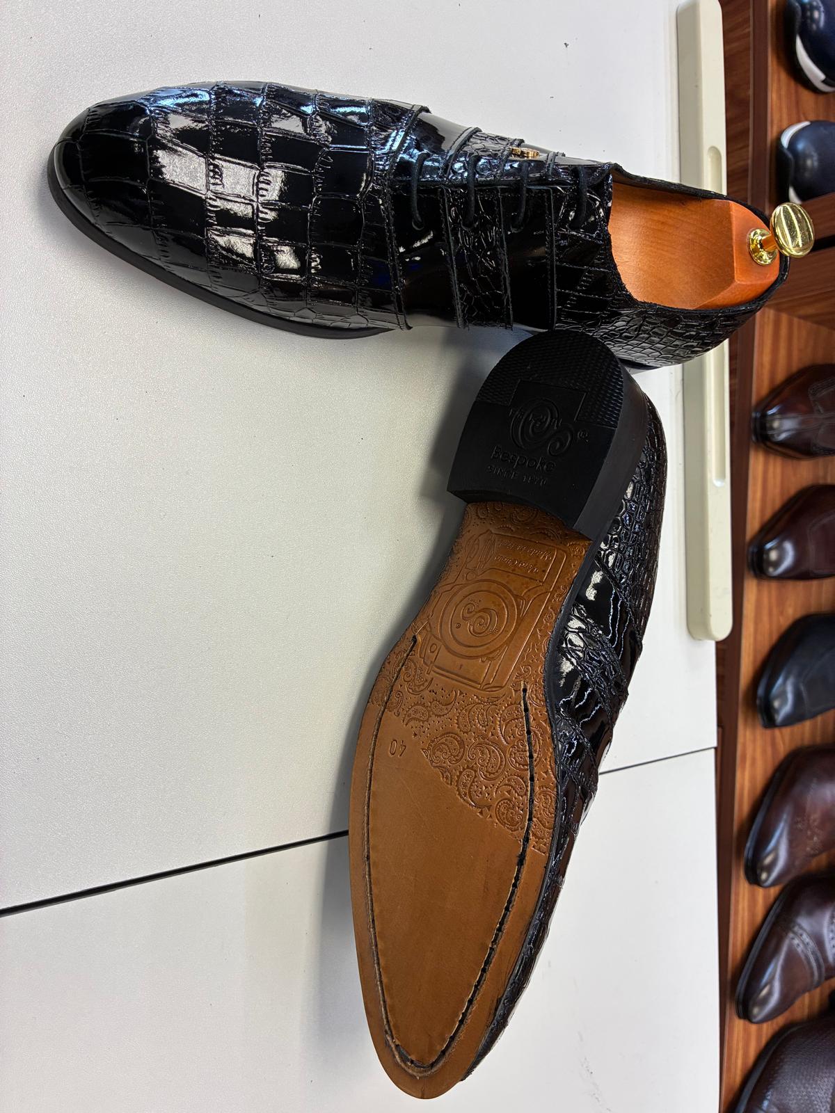 Luxurious black patent leather Oxford shoes featuring an embossed crocodile texture, high-gloss finish, and sleek lace-up design, crafted to deliver bold elegance and commanding presence for premium formal occasions.