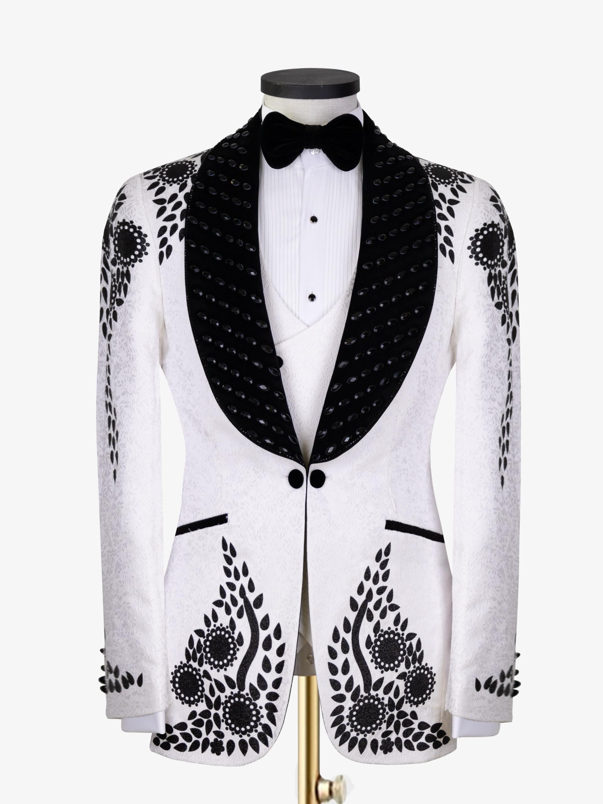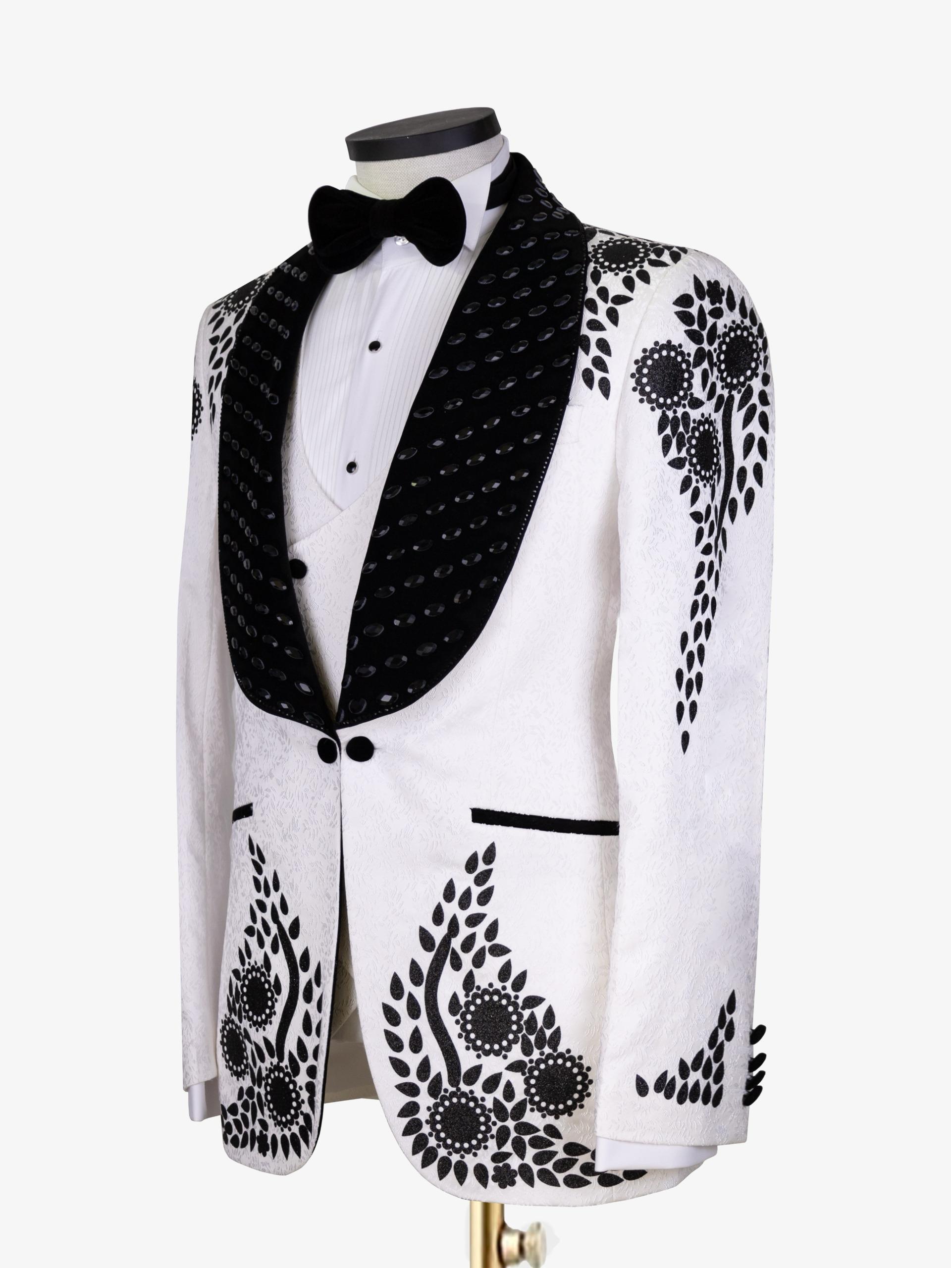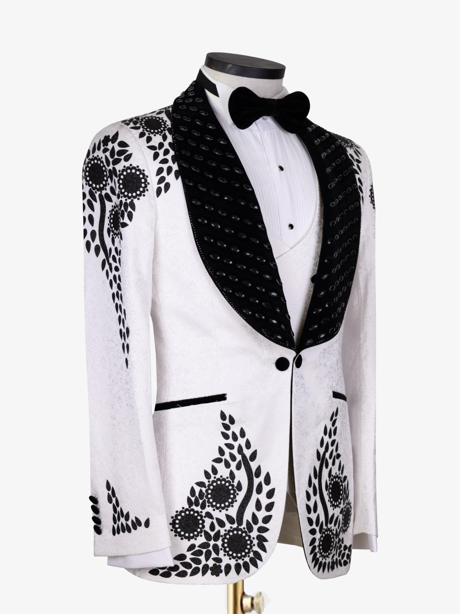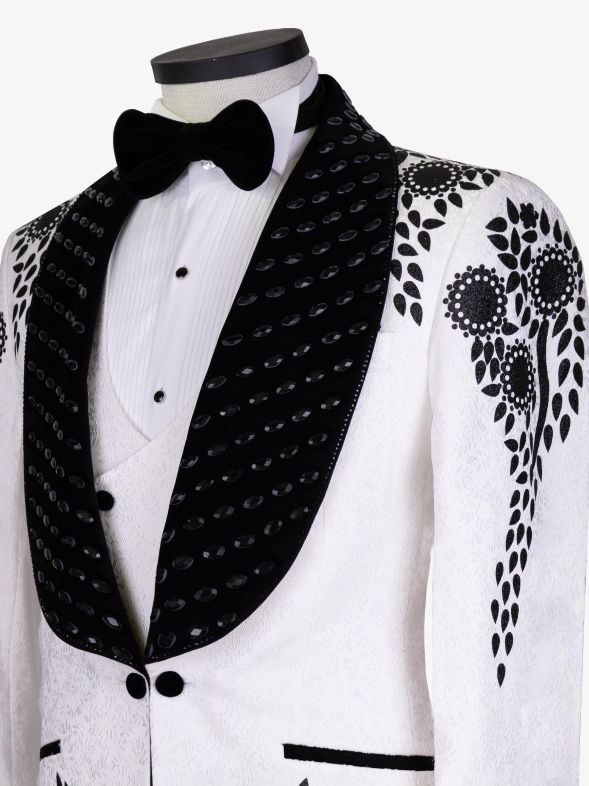 An elegant ivory tuxedo accented with bold black floral embroidery, a contrasting embellished shawl lapel, and a classic bow tie, crafted for weddings, galas, and standout formal occasions.