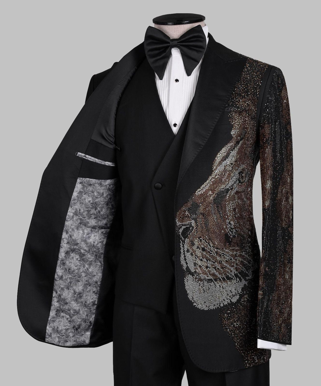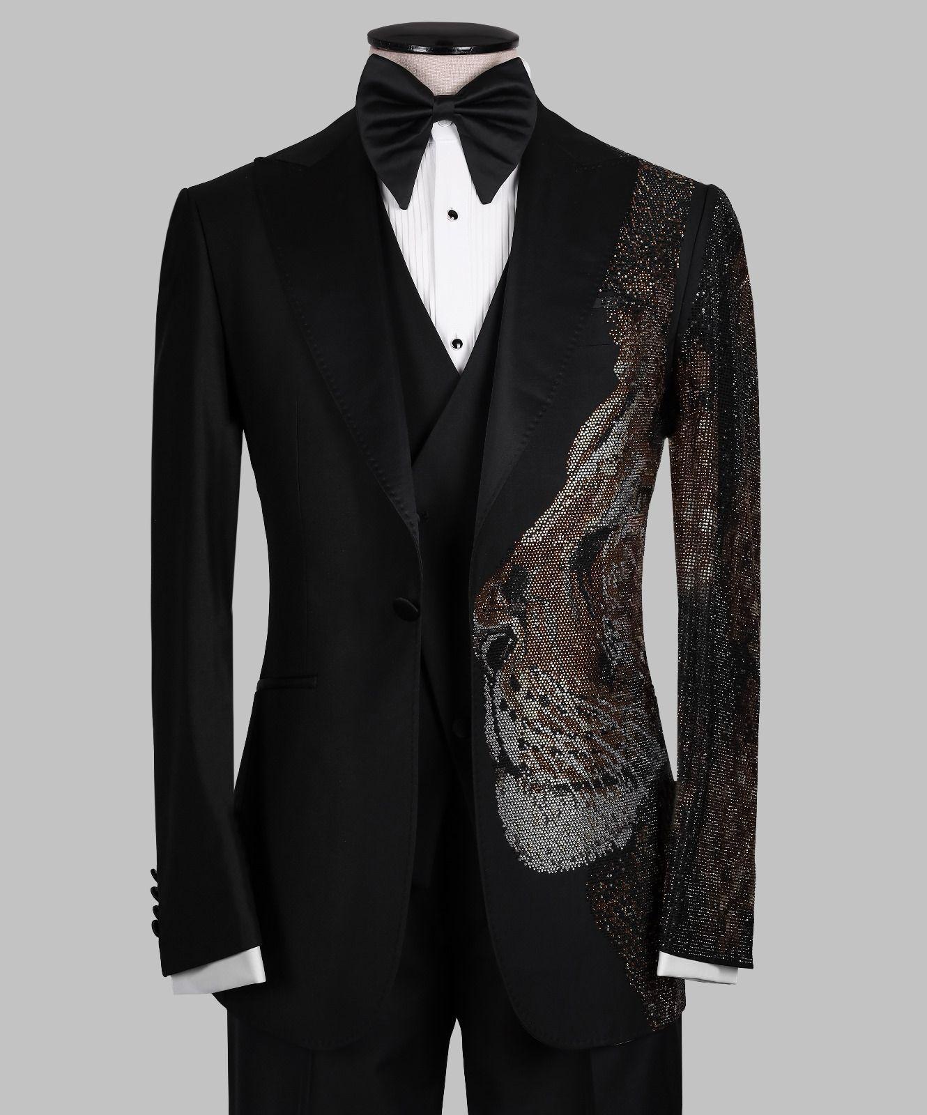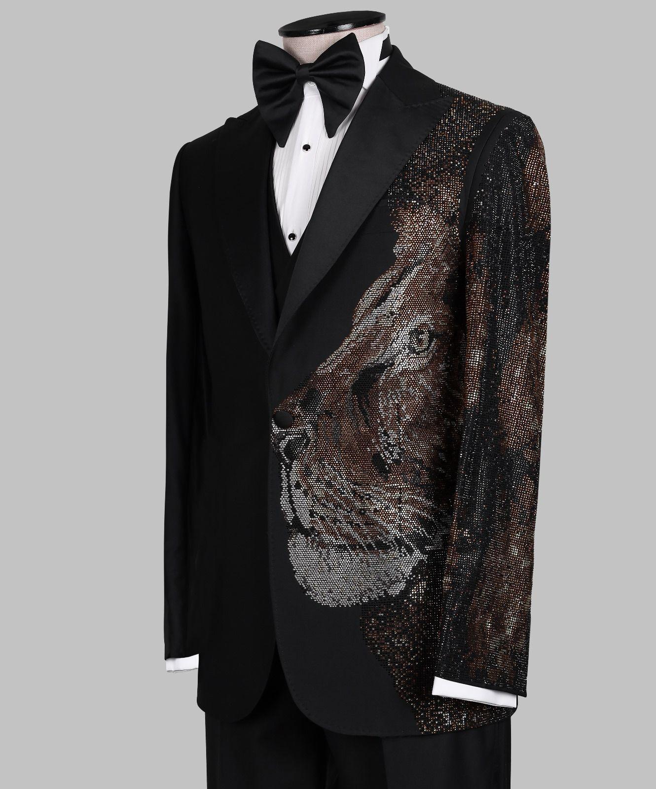 A luxurious black tuxedo with a stunning lion face design crafted from intricate beadwork and rhinestones, making a bold statement in formalwear. Paired with a classic black bow tie, this piece exudes strength and elegance for a truly captivating look.