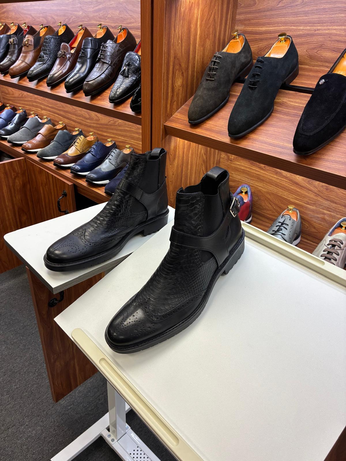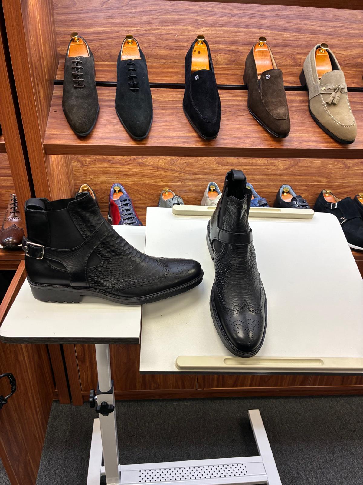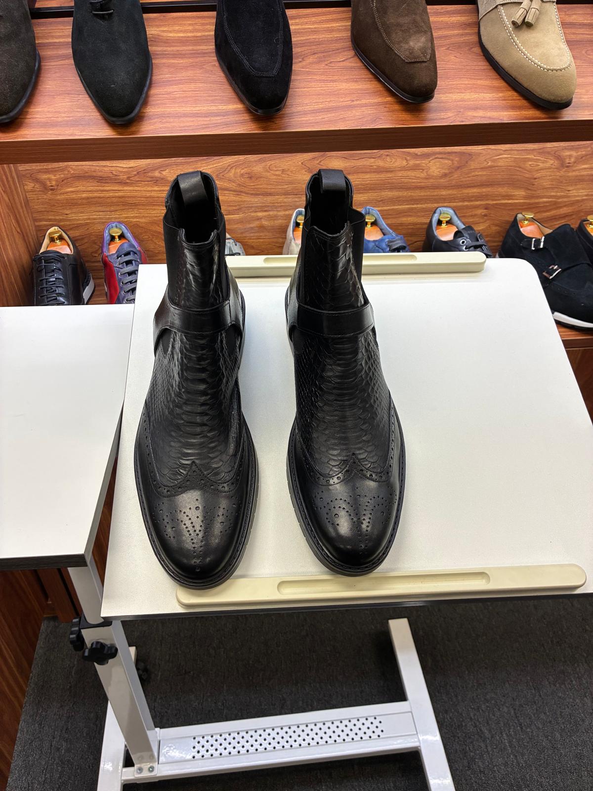 Premium black leather boots featuring a textured finish, side buckle detail, and classic brogue accents. Designed for formal and smart-casual wear, offering a bold, stylish look with a comfortable fit and durable sole.