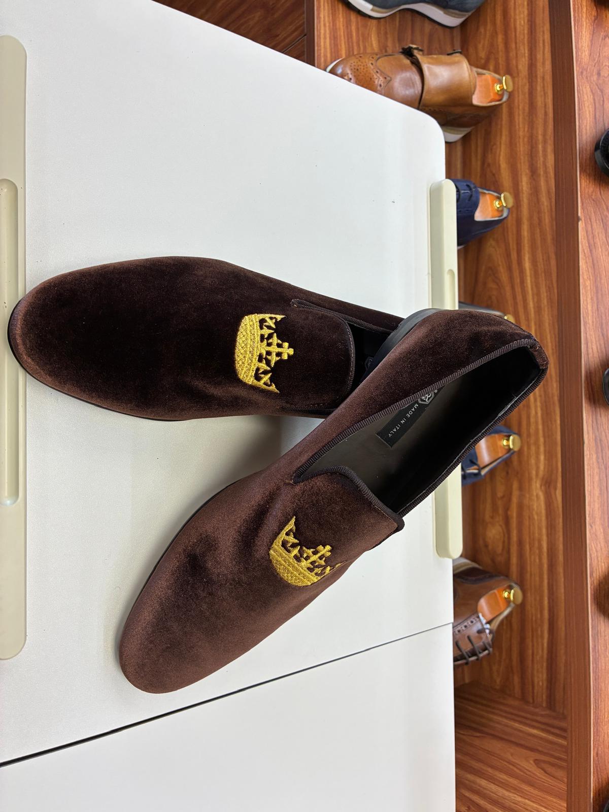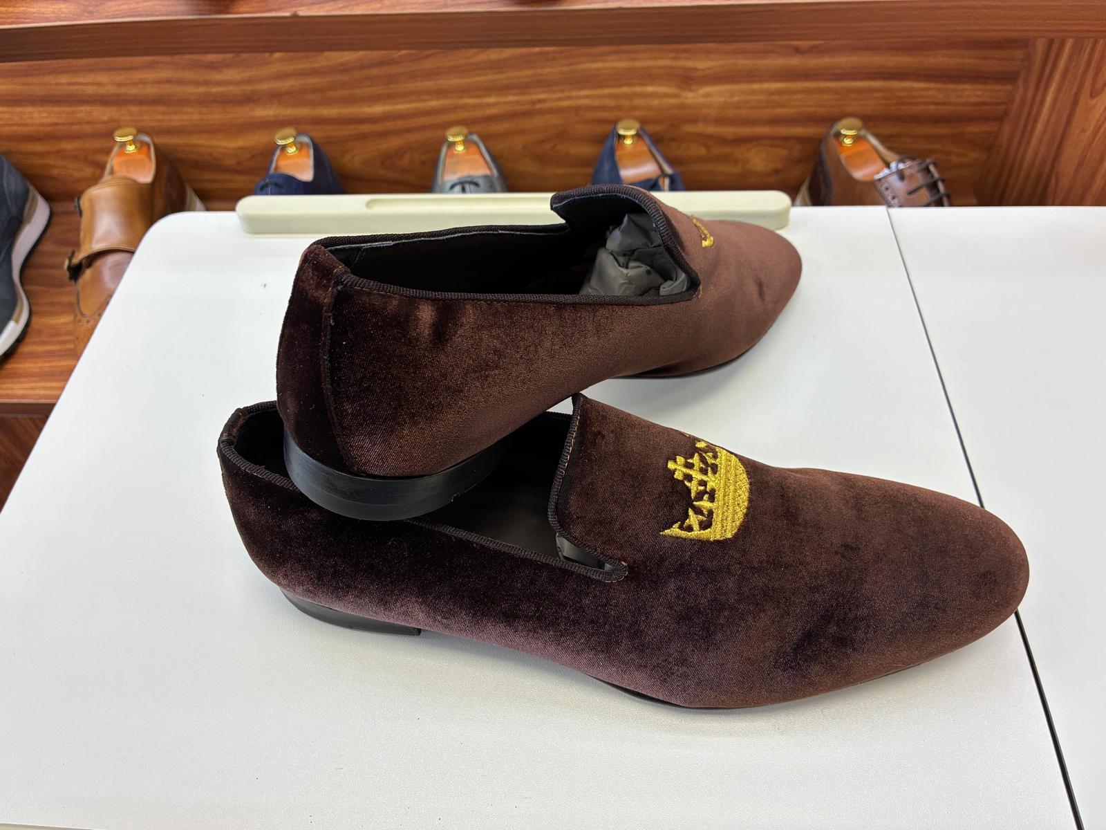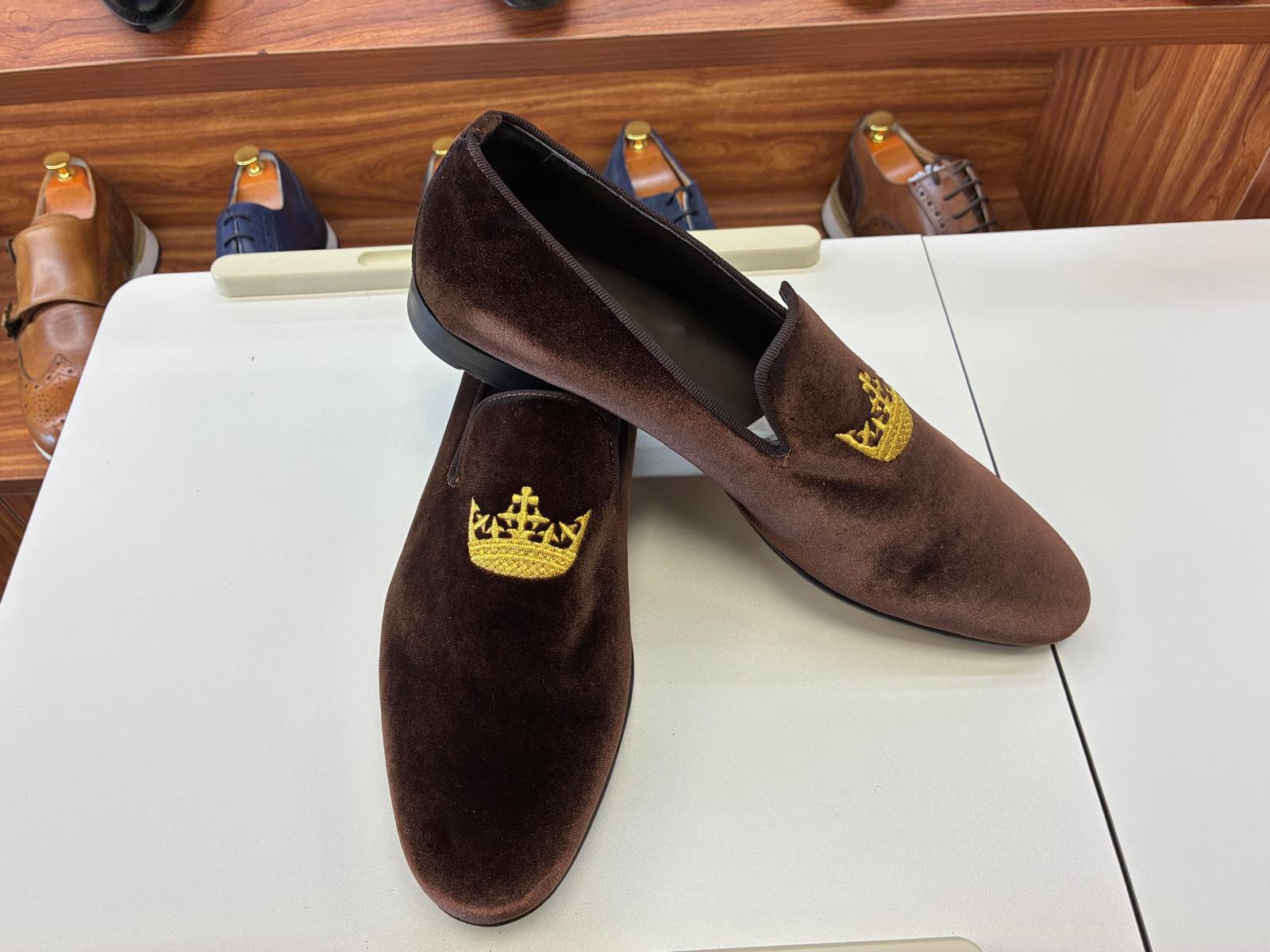 Premium brown velvet loafers featuring elegant gold crown embroidery on the upper. Designed for weddings, festive occasions, and formal events, offering a luxurious look with comfortable slip-on wear.