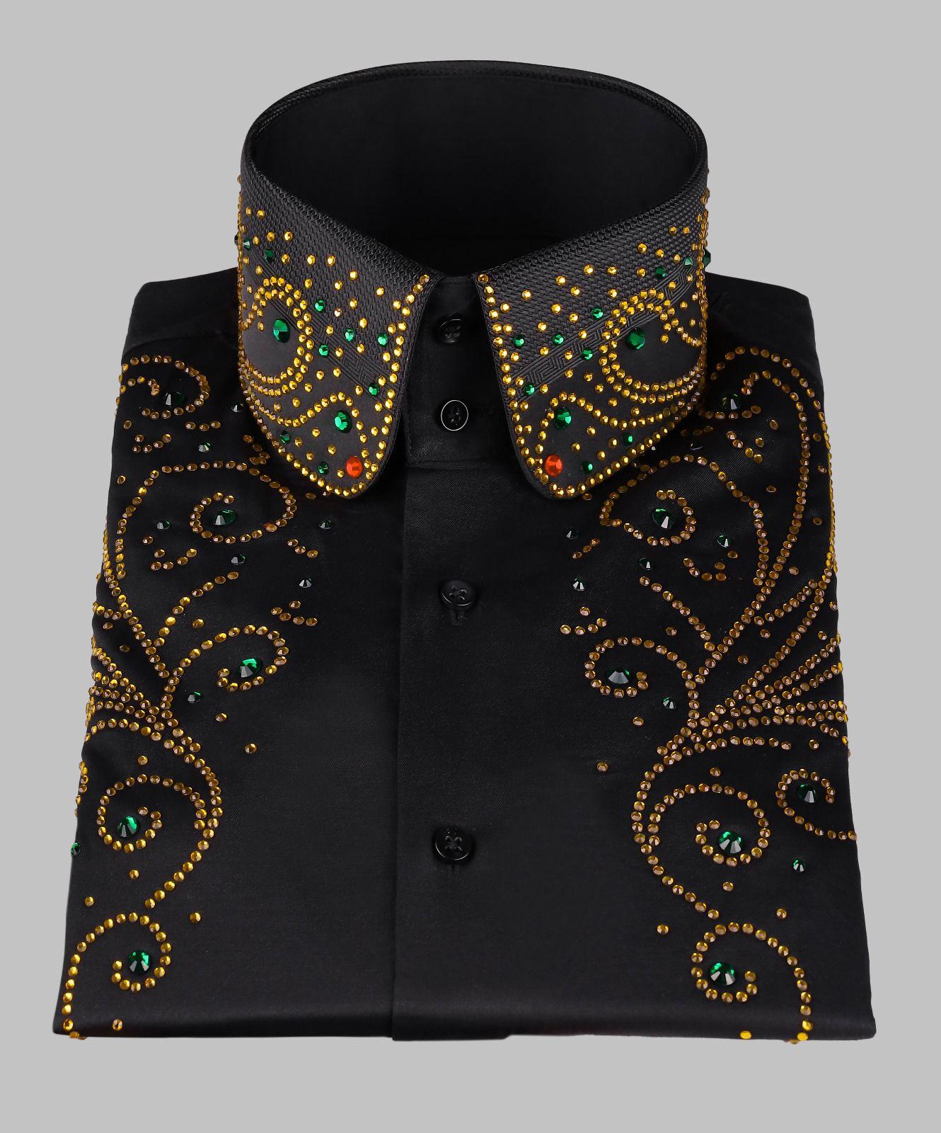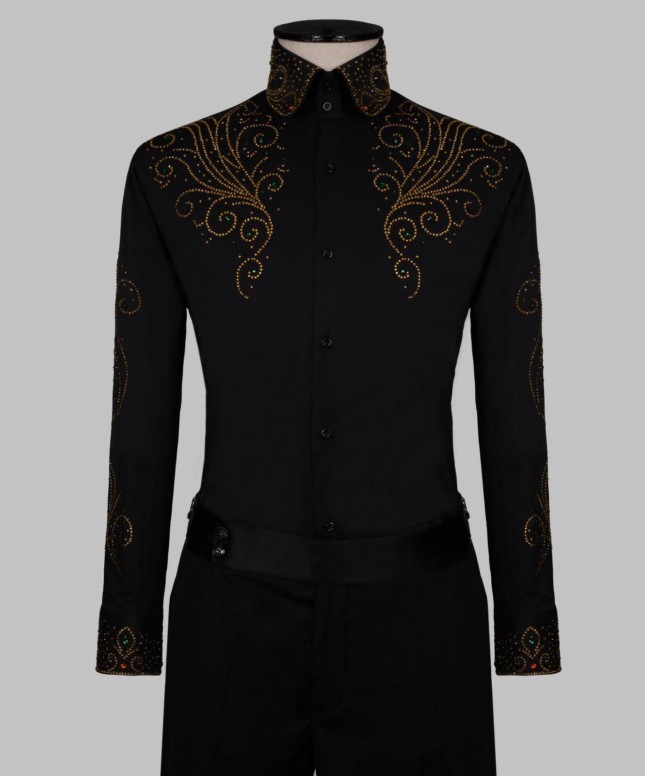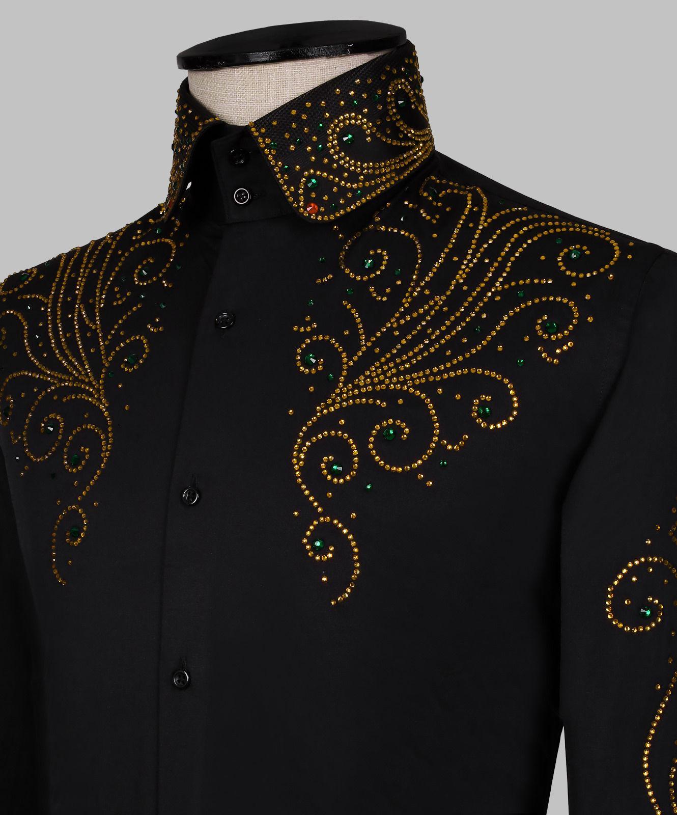 A sleek black long-sleeve shirt adorned with intricate gold crystal embellishments on the chest, collar, and cuffs, designed to deliver a bold, luxurious statement for formal evenings and standout occasions.