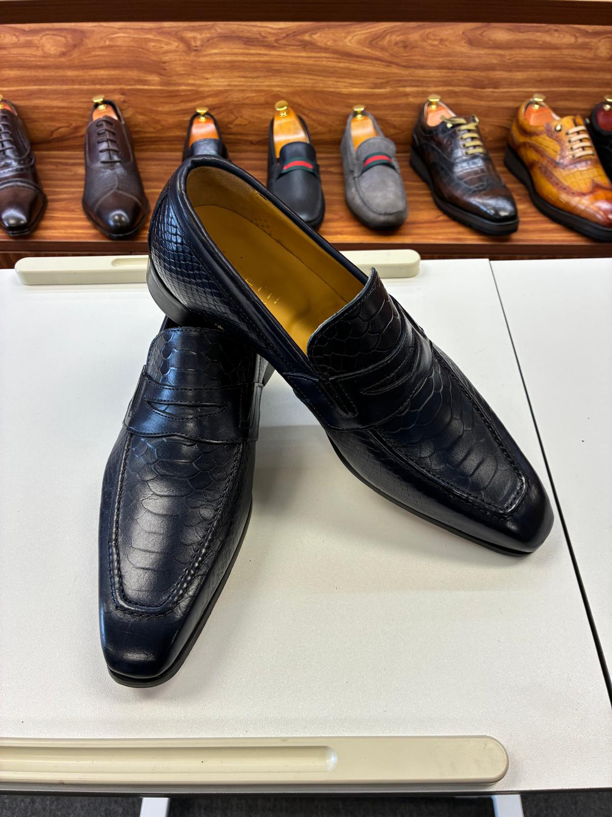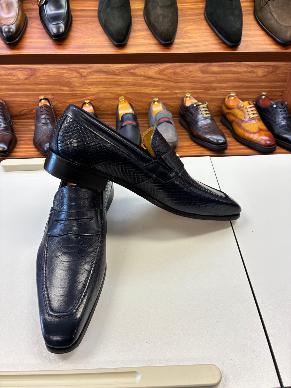 Refined and versatile, these Midnight Scale Penny Loafers feature a deep navy blue finish with a subtle scale-textured leather design. Crafted for a polished look and everyday comfort, they offer a sleek profile and soft inner lining—ideal for office wear, formal occasions, or smart casual styling.