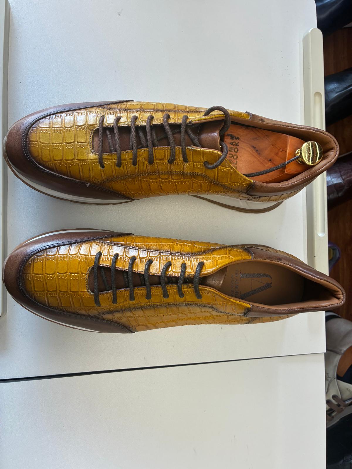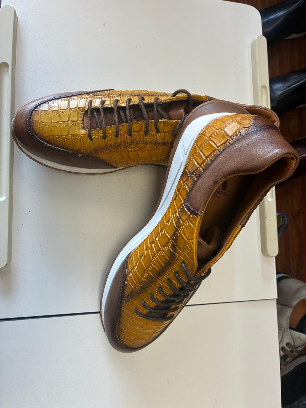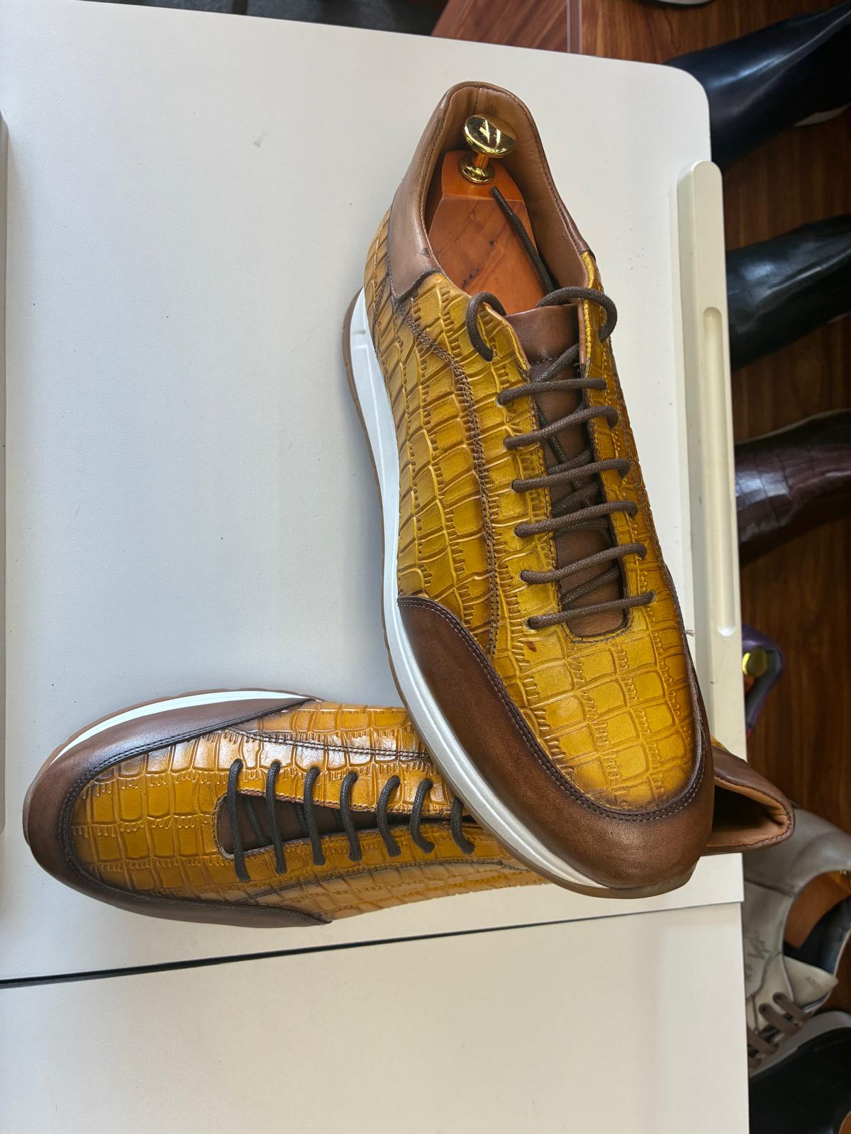 Stand out in style with these mustard croc-embossed leather sneakers, finished with rich brown accents and a durable grip sole. Designed for all-day comfort, they deliver a bold yet refined look perfect for smart-casual wear.