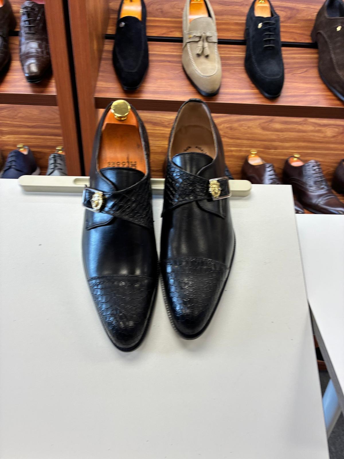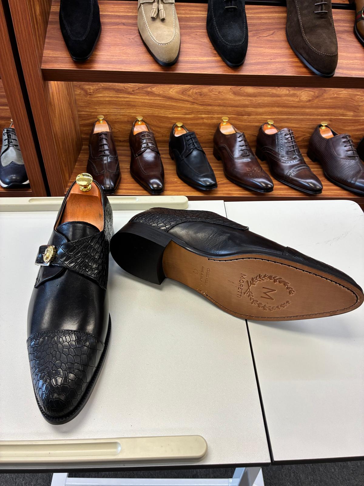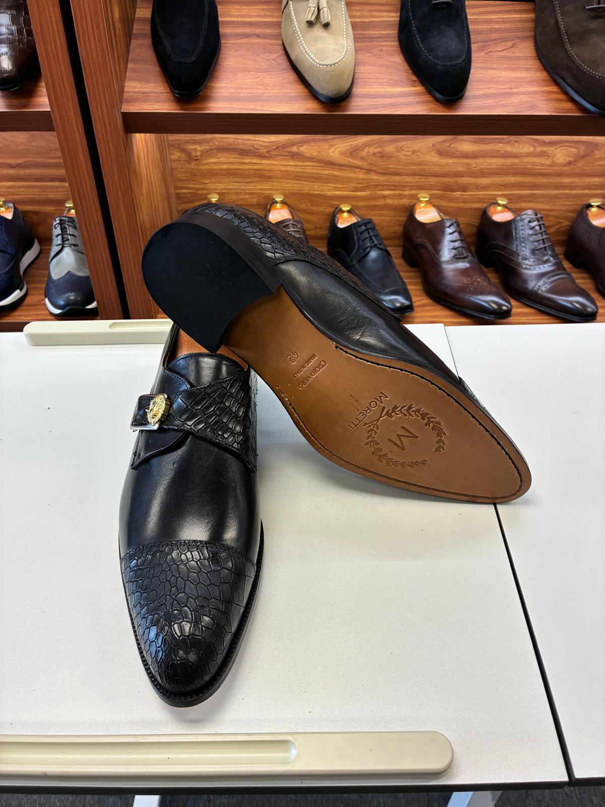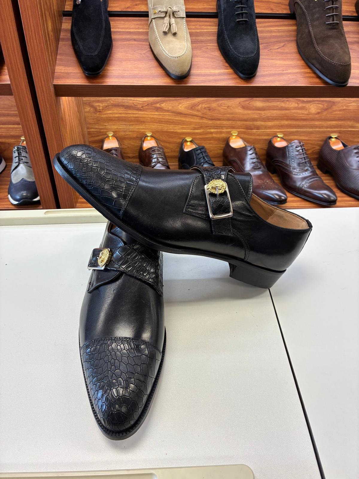 This refined dress shoe combines rich black leather with textured croc detailing for a bold yet controlled look. Finished with a statement buckle, it’s ideal for evening events, formal occasions, and confident modern styling.
