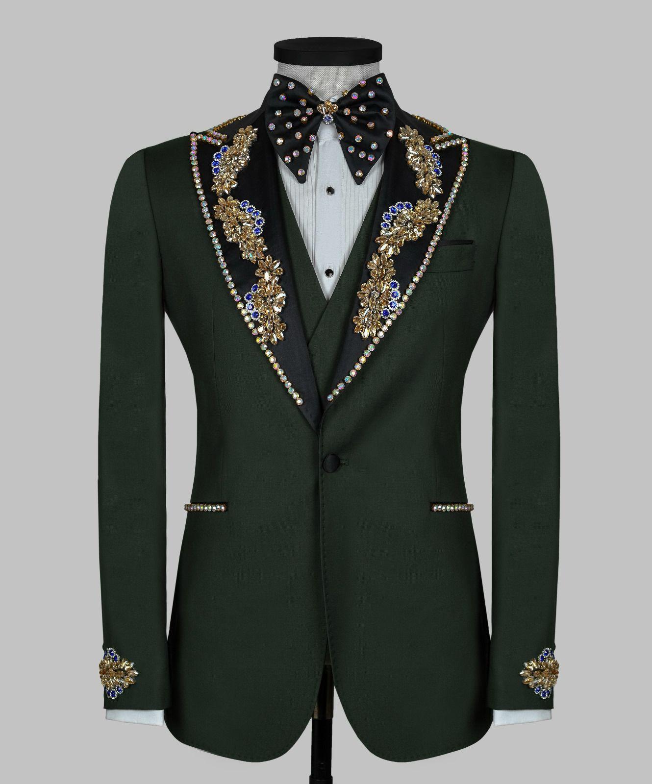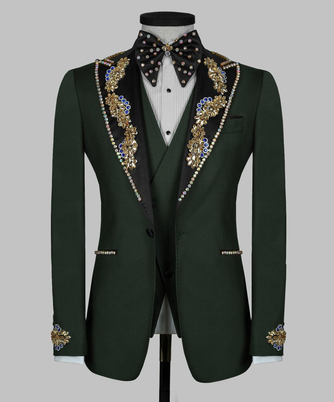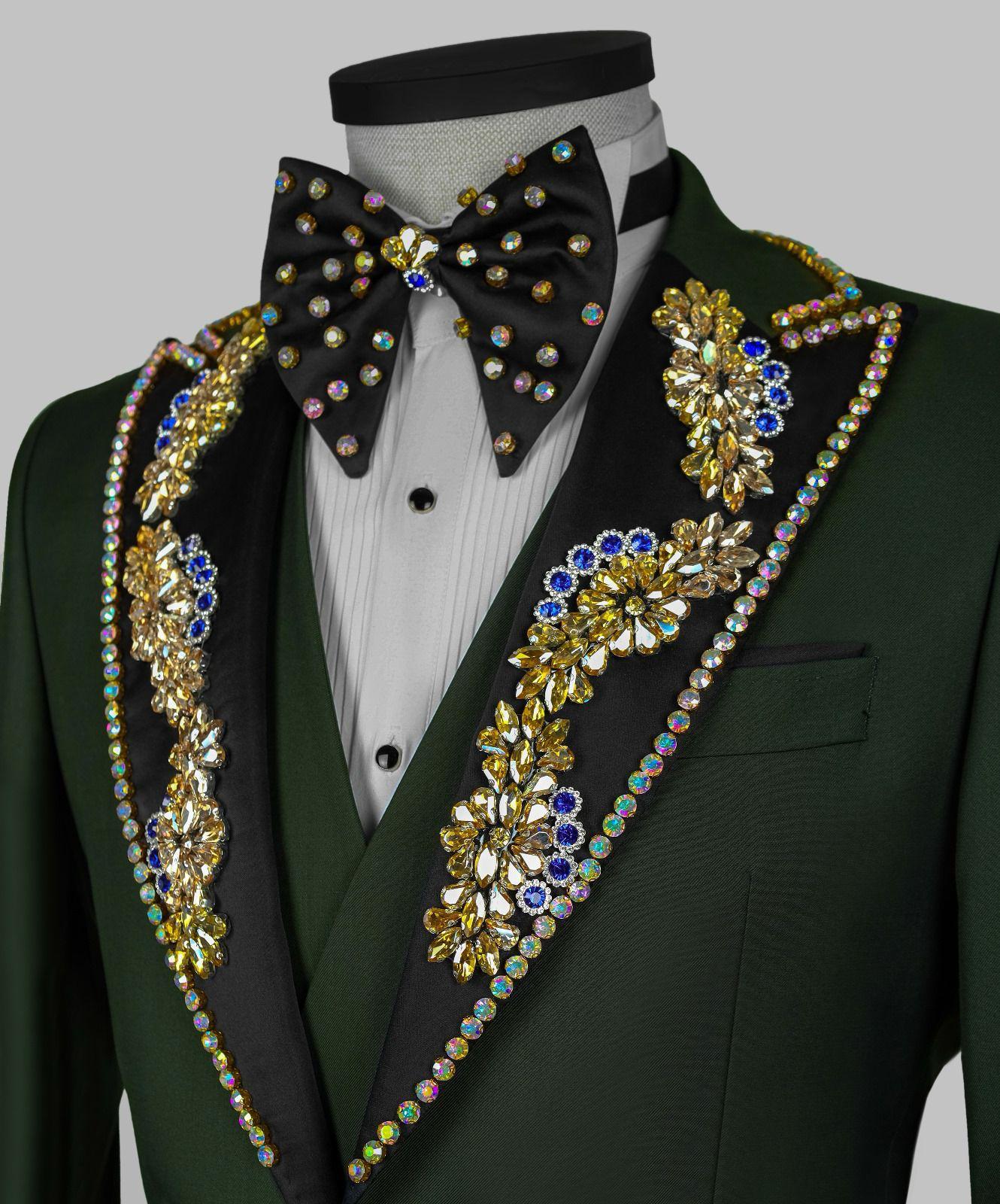 A luxurious green tuxedo jacket adorned with intricate gold and jewel embellishments, featuring a statement bow tie and velvet accents for a high-fashion, glamorous look. Perfect for upscale events and formal occasions.