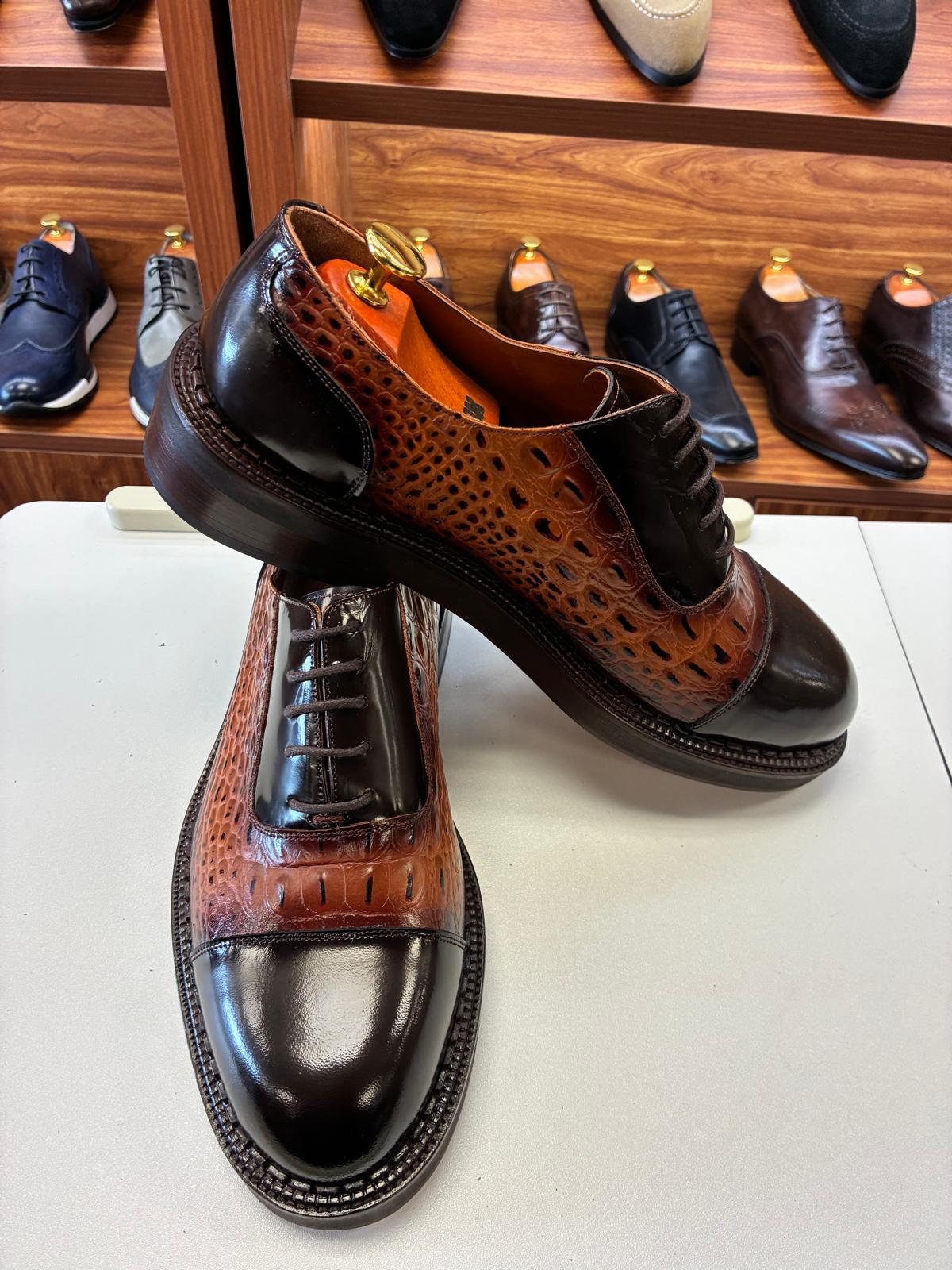 Elegant two-tone leather Oxford shoes featuring a polished cap-toe, rich textured panels, and refined lace-up design, crafted to deliver timeless sophistication for formal and business wear.