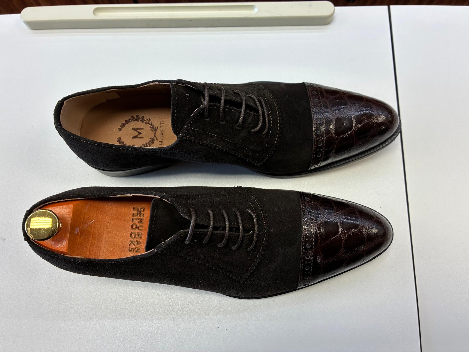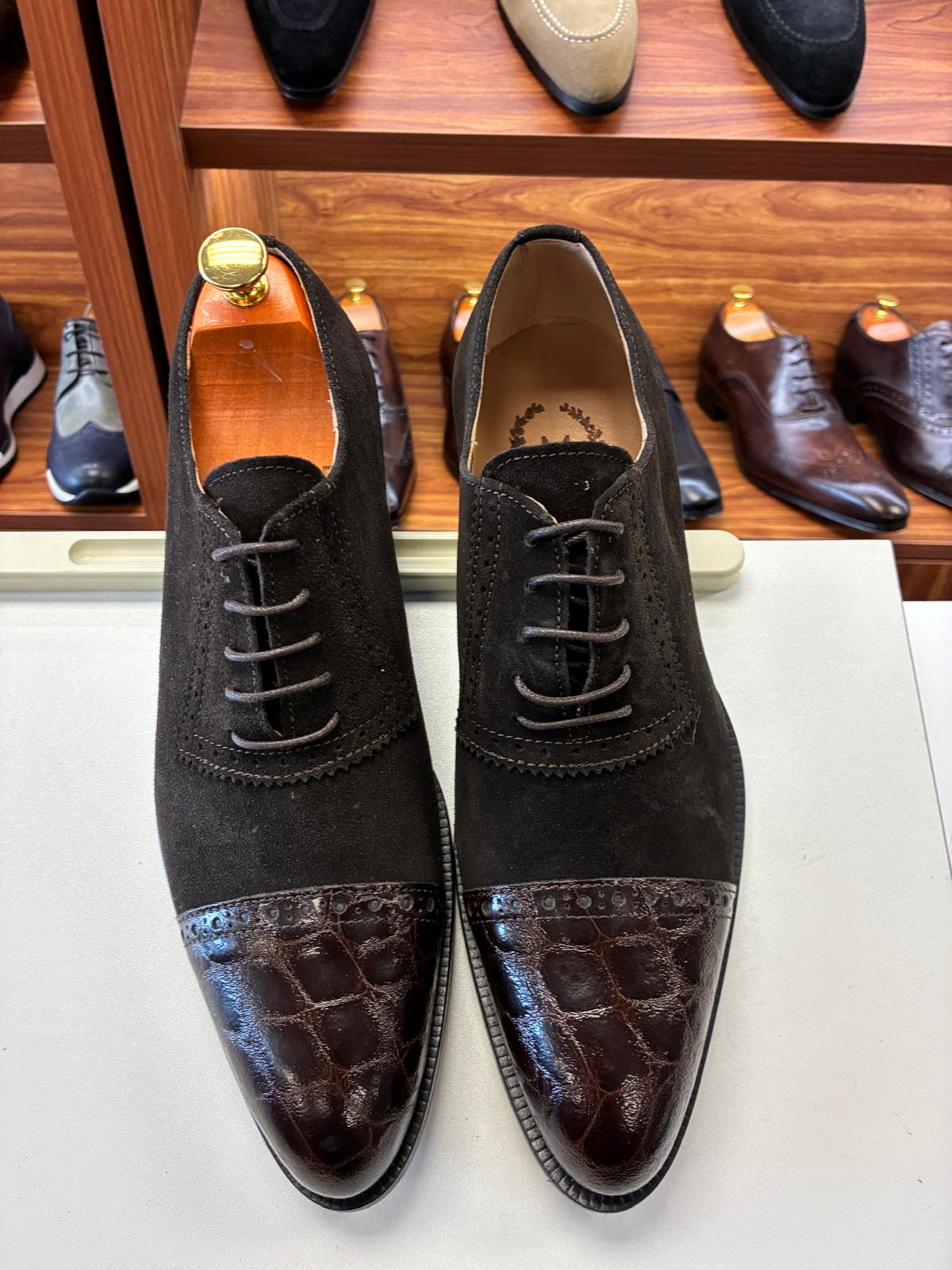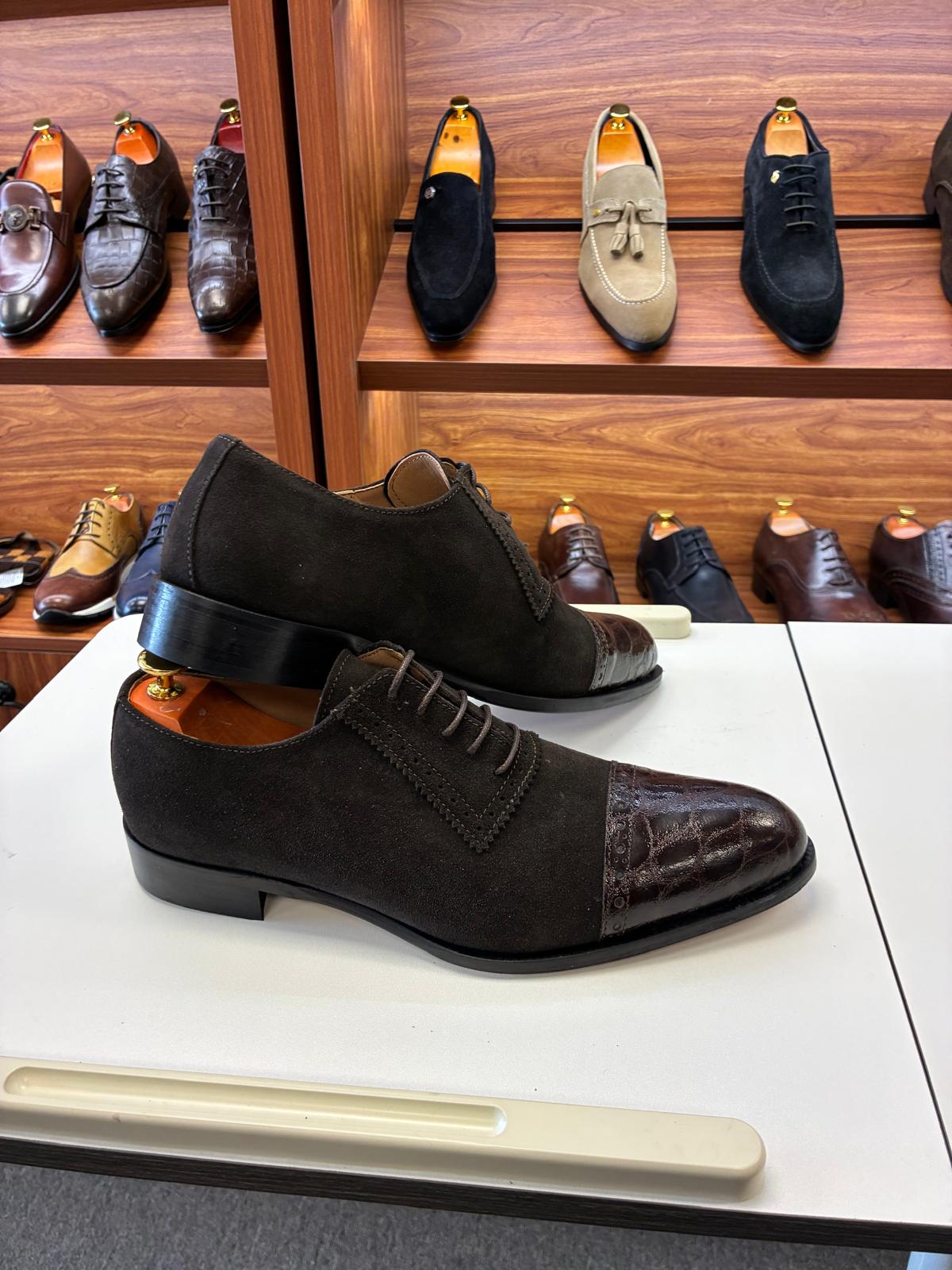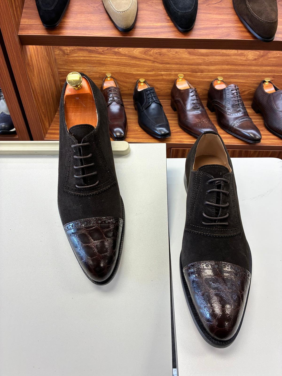 Elegant dress shoe combining soft black suede with a crocodile-embossed leather cap toe. Designed for refined contrast and timeless appeal, ideal for formal and smart business wear.