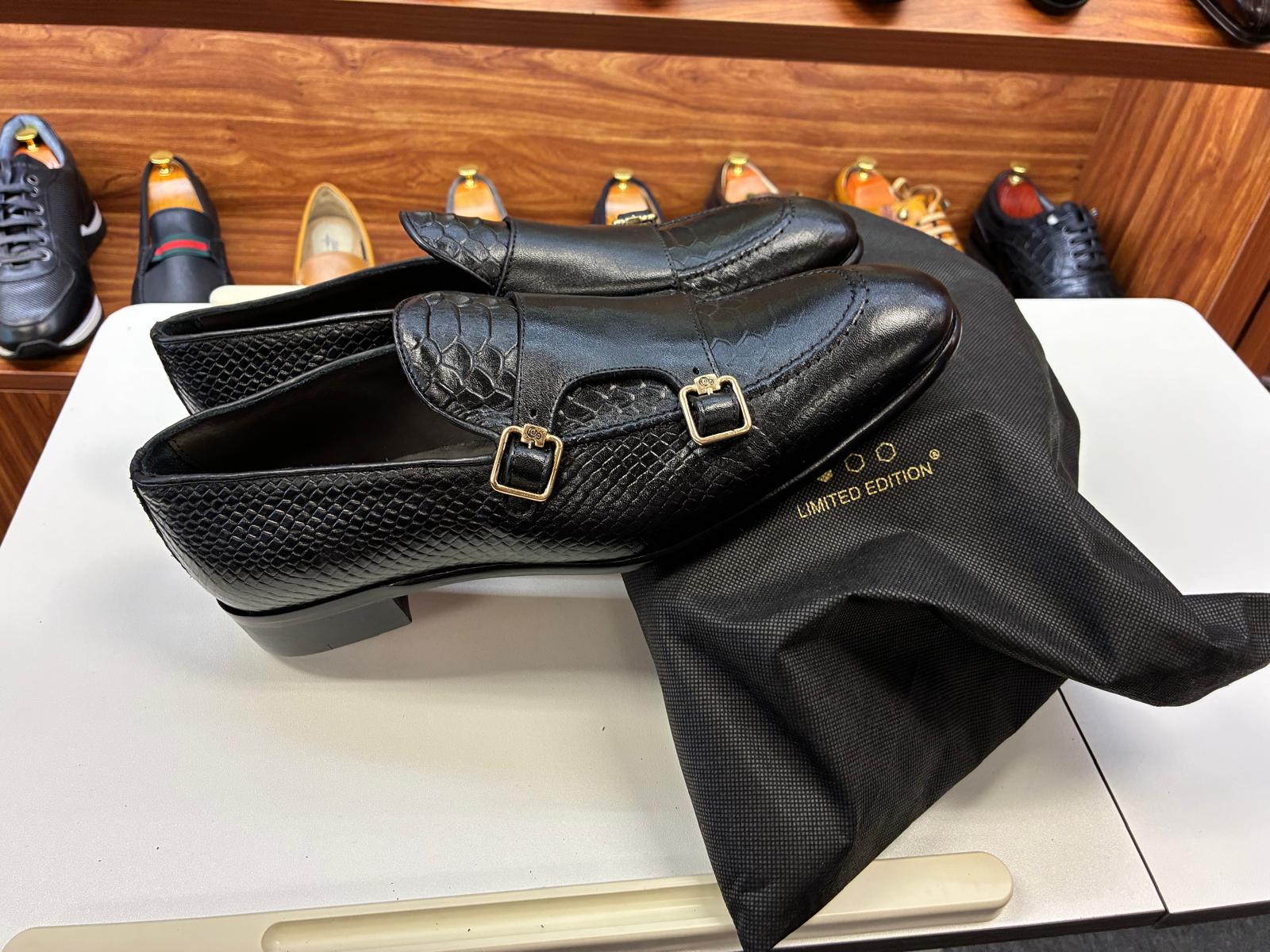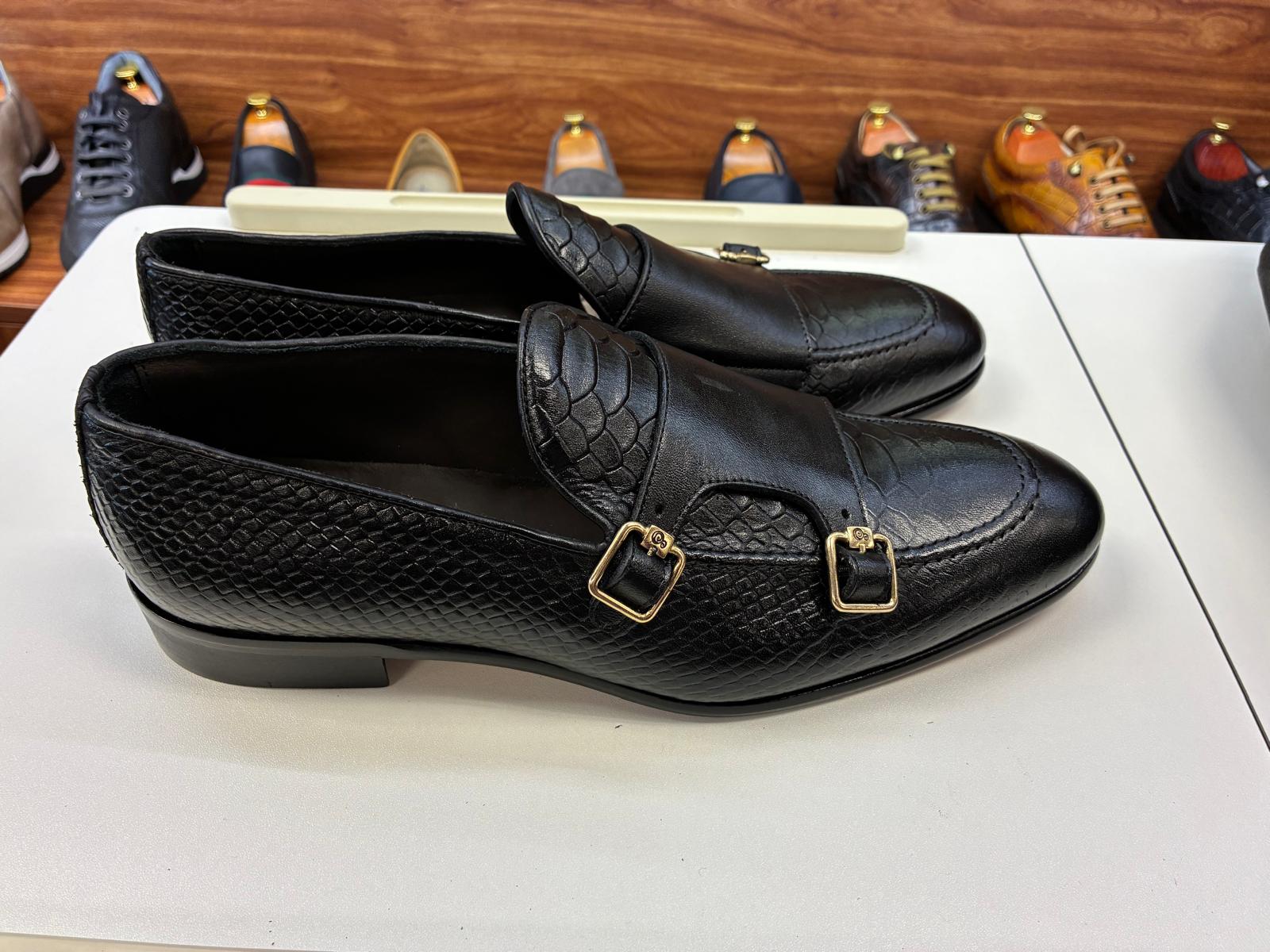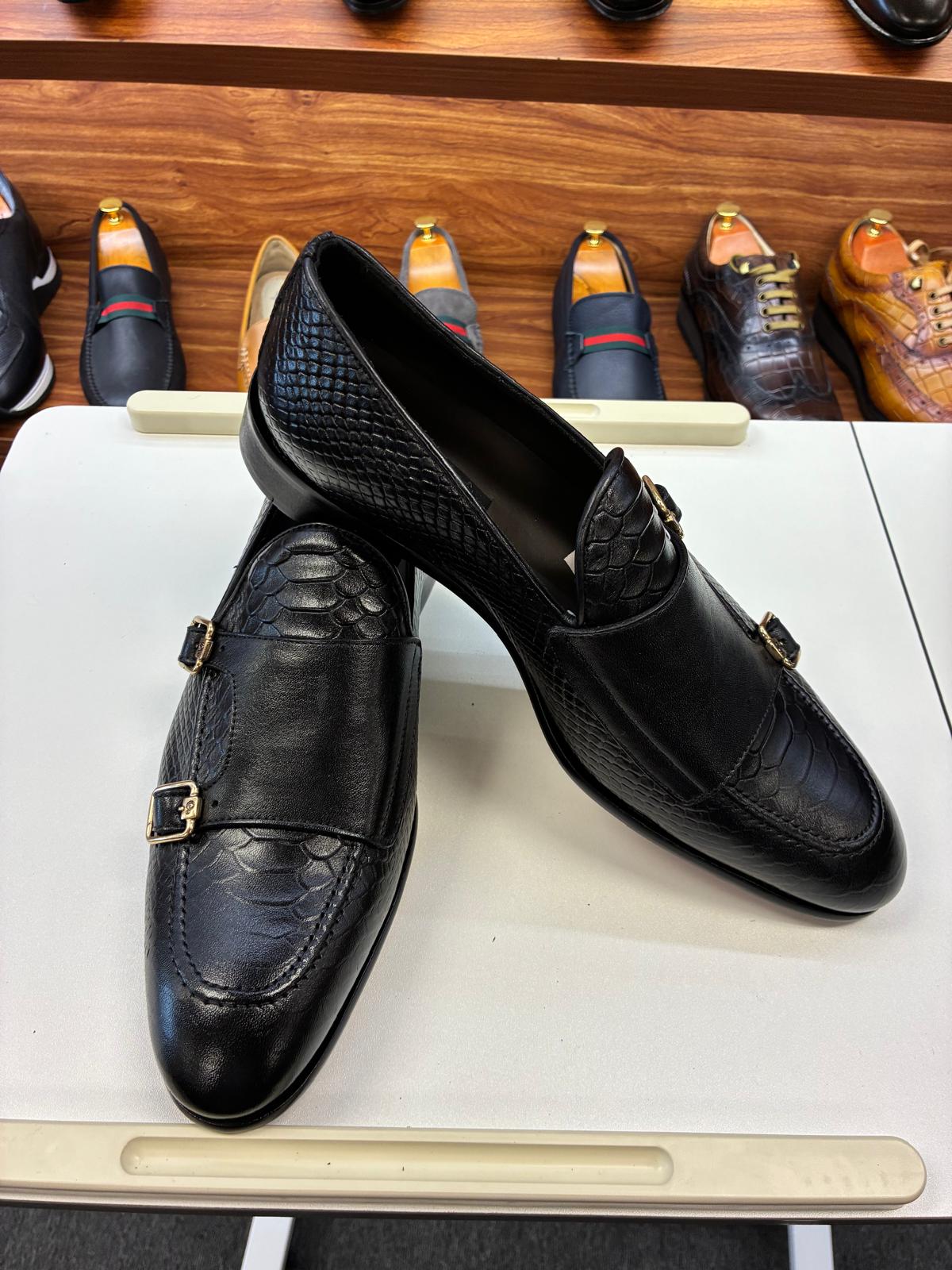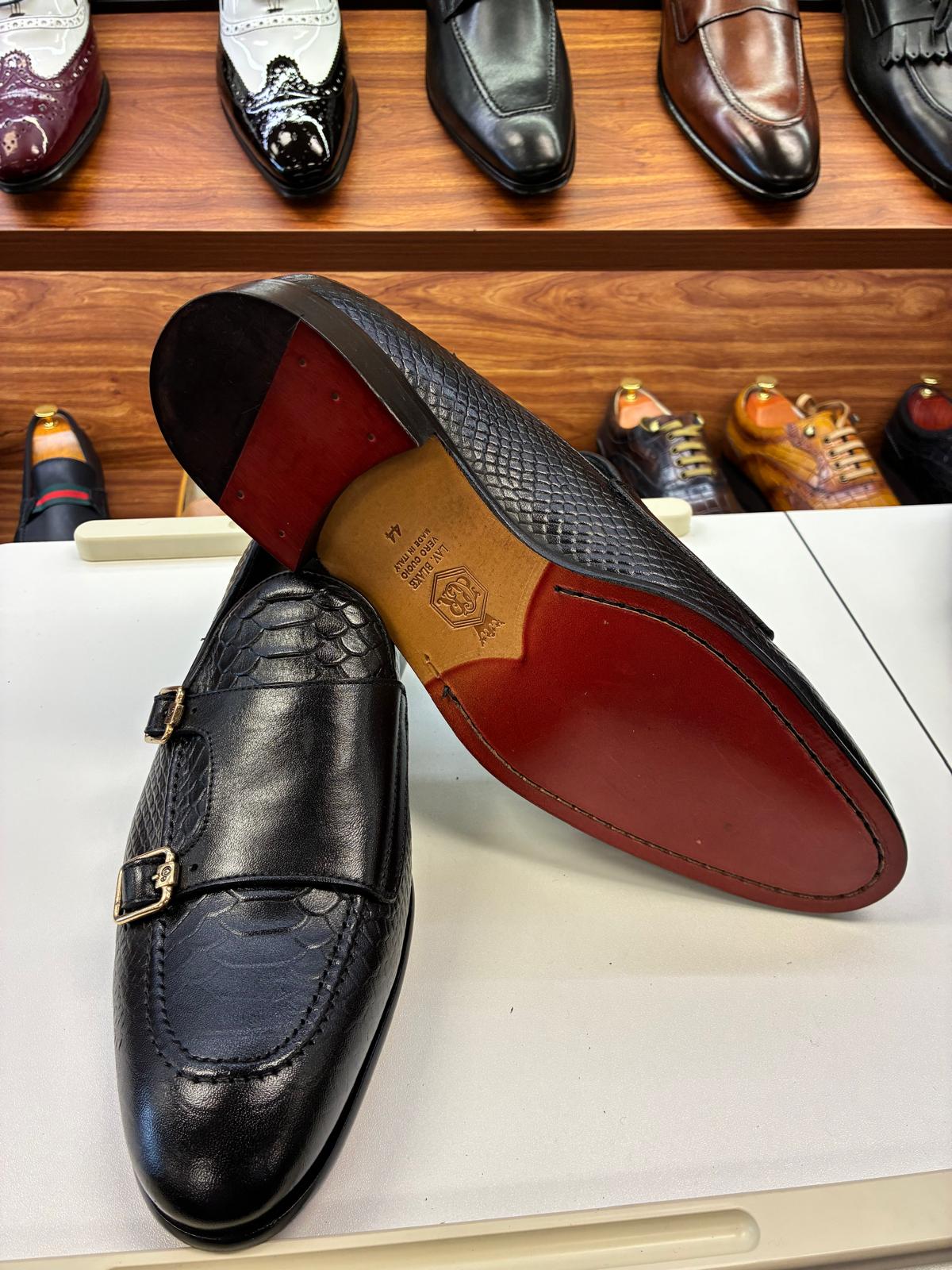“Command the room with the Onyx Scale Double Monk. This Italian-made masterpiece reinvents the classic monk-strap with a daring, large-scale texture contrasted against silky-smooth black leather. Finished with high-shine gold hardware, it is the definitive choice for the modern executive who values bold, unconventional elegance.”