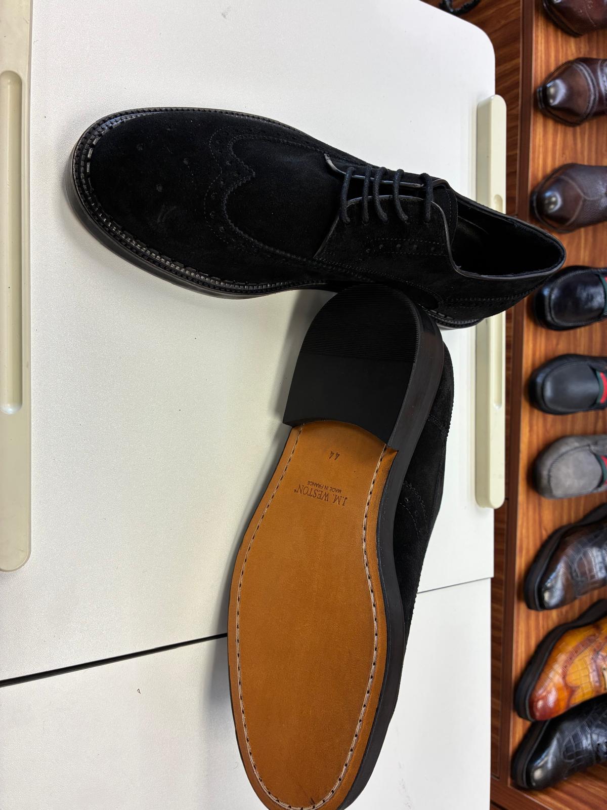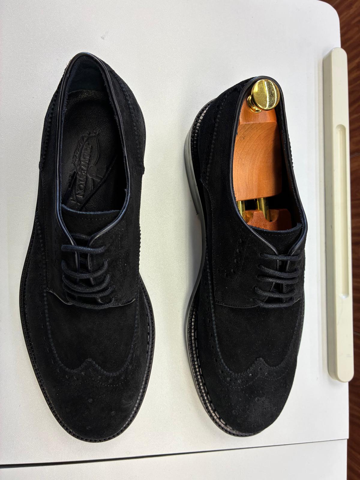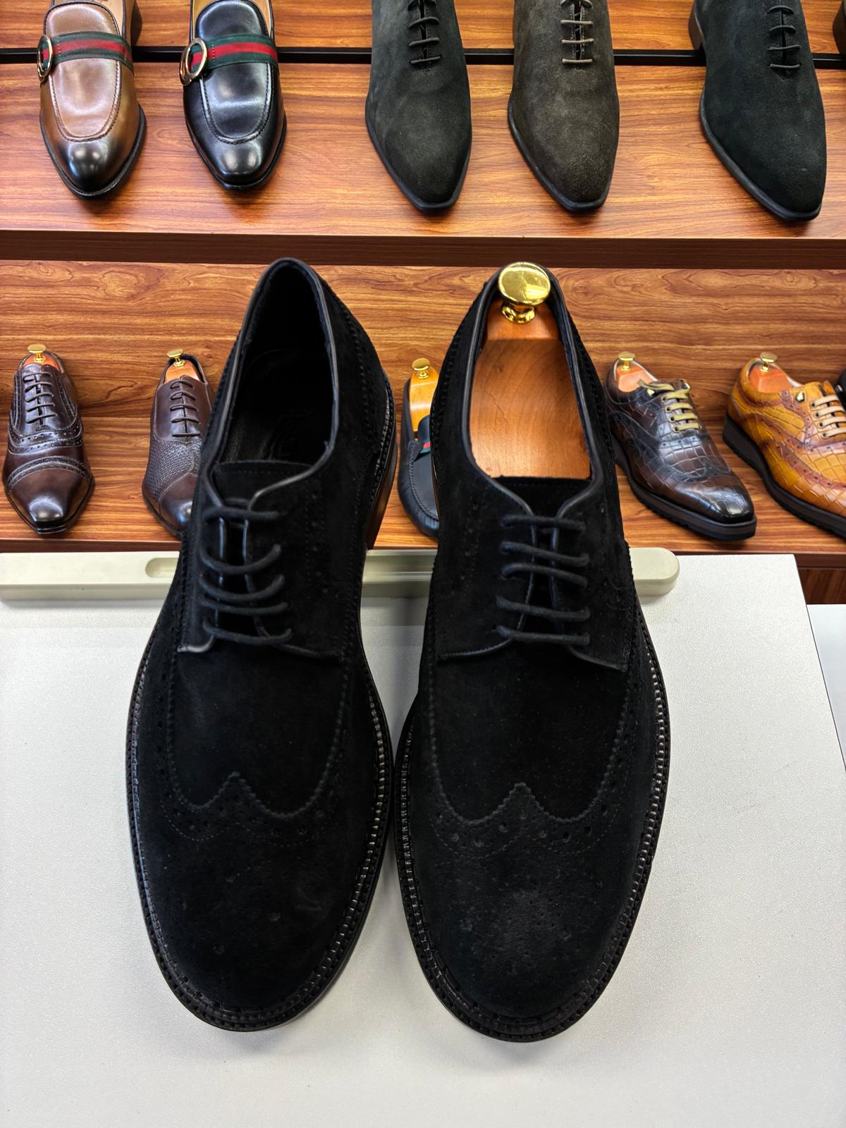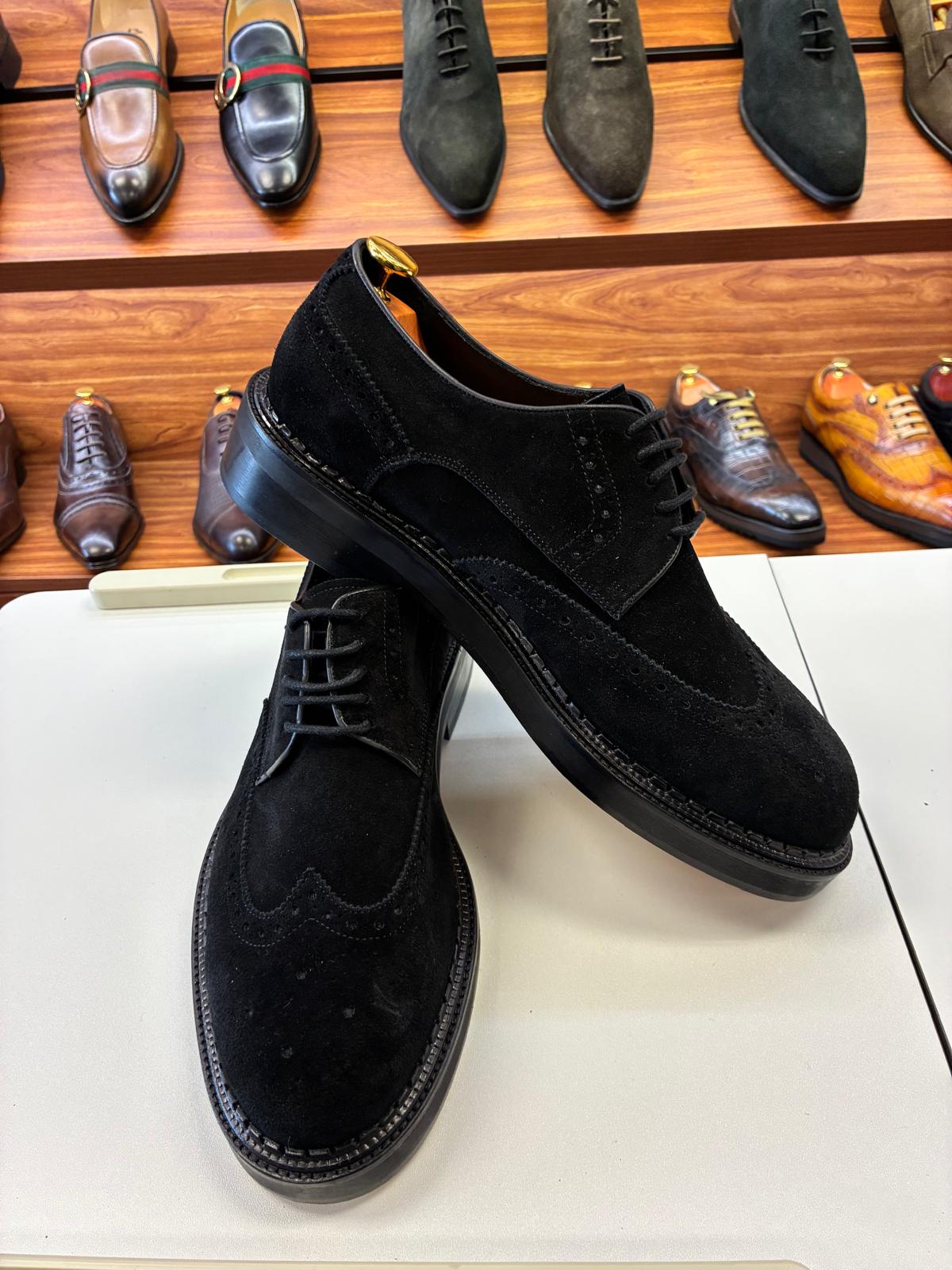 Classic black suede Oxford shoes featuring a soft matte finish, elegant brogue detailing, and a refined lace-up design, ideal for understated luxury in formal and evening wear.